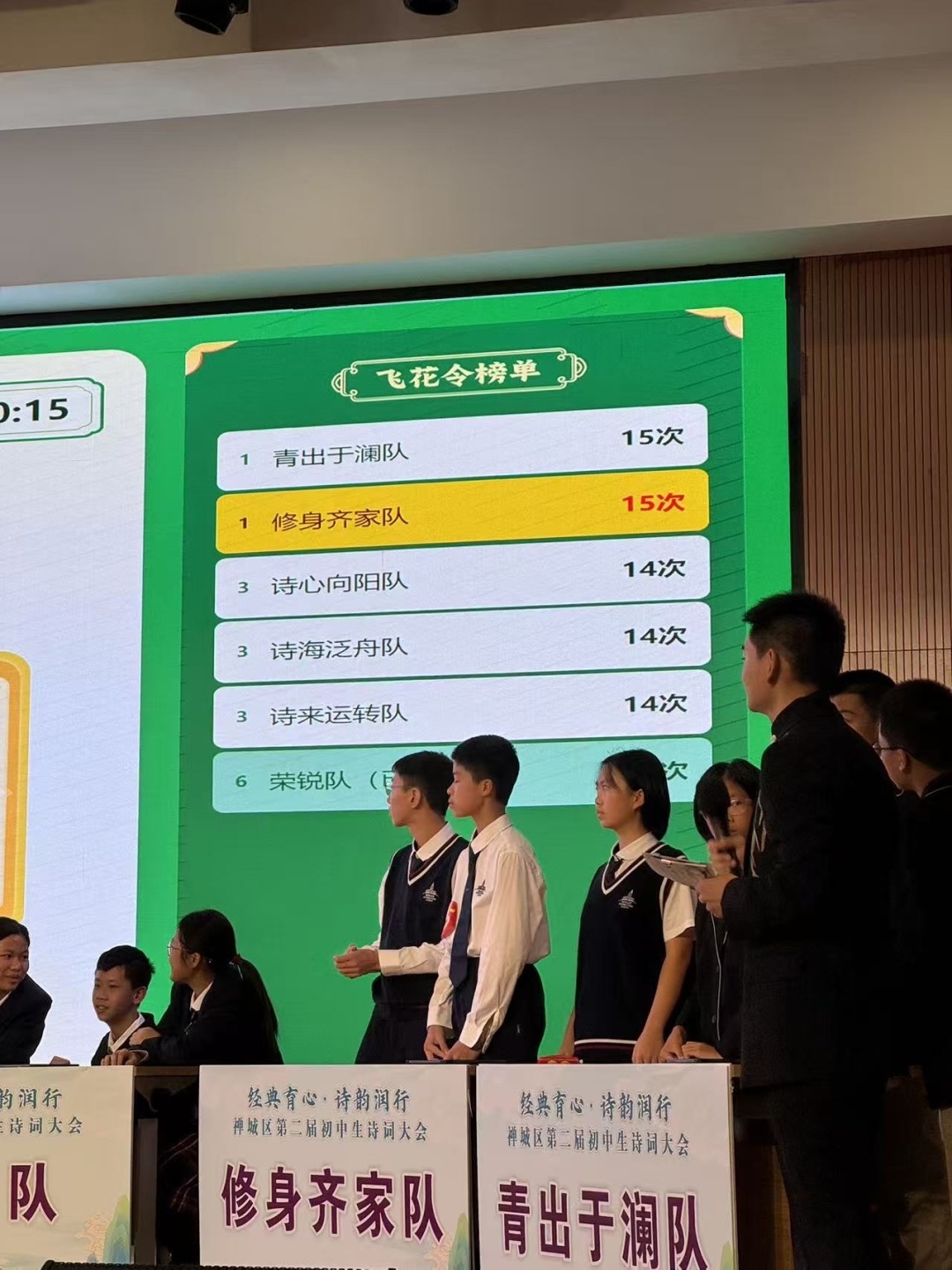 11月21日,佛山市禅城区初中第二届诗词大会决赛中,禅城区明德中英文学校的“修身齐家”代表队凭借深厚的诗词积淀与沉稳的临场发挥,历经必答题、抢答题、飞花令等多轮鏖战,最终从众多强队中脱颖而出,一举夺魁!尤其在围绕“花”字的飞花令环节,该校学子一战到底,激战28回合,从“花间一壶酒”到“风住尘香花已尽”,句句珠玑、从容不迫,展现出惊人的诗词储备与应变能力,将全场气氛推向高潮。