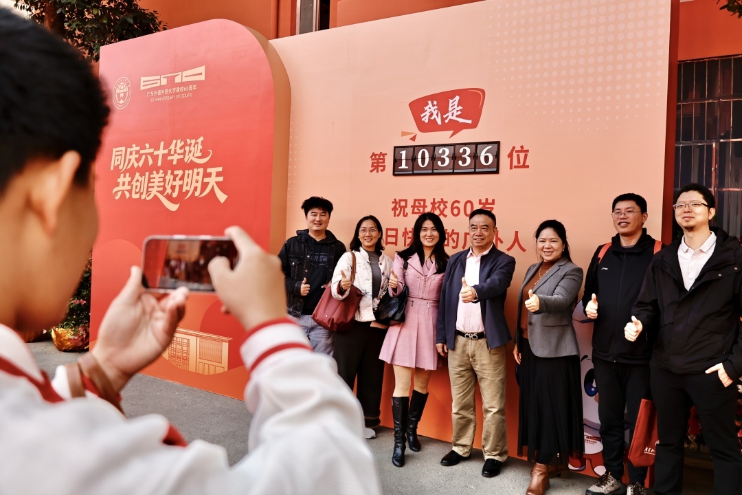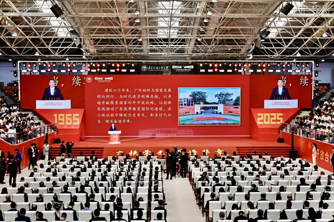 场馆内外,巨幅标语“六秩荣光,再谱华章”、醒目的60周年校庆徽标营造出昂扬热烈的喜庆氛围。大会现场播放的学校宣传片回顾了广外六十载薪火相传、砥砺奋进的奋斗历程。