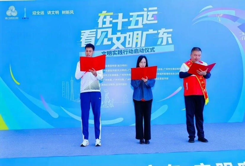 文明是城市最美的风景,也是迎接四海宾朋最好的礼仪。今年4月,“迎全运讲文明树新风”广州市“文明迎全运”百场主题实践活动在广州市文化馆启动。活动现场,全国道德模范赵广军、中国好人陈晓霞等先进典型代表共同发起“文明迎全运”倡议,号召广大市民群众以文明之姿迎接全运盛会。