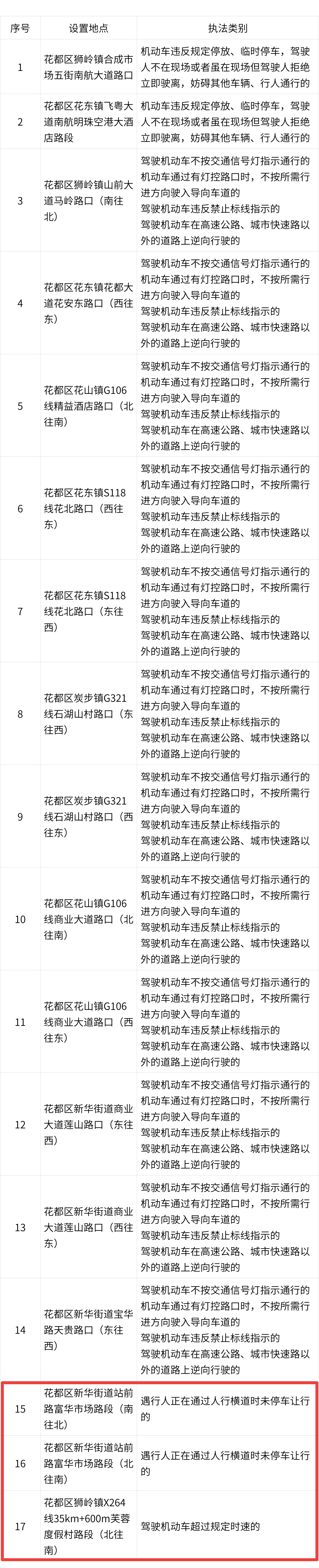 为进一步加强花都区道路交通安全管理,规范道路交通通行秩序,保障人民群众的生命财产安全,花都公安交管部门将启用17套交通技术监控设备。根据公安部《道路交通安全违法行为处理程序规定》(公安部第157号令)第十六条规定,公安交管部门现向社会公布。该批启用的设备将于2025年11月28日开始依法对有交通违法行为的车辆进行拍摄取证并予以执法,请广大驾驶人守法出行、安全驾驶。
