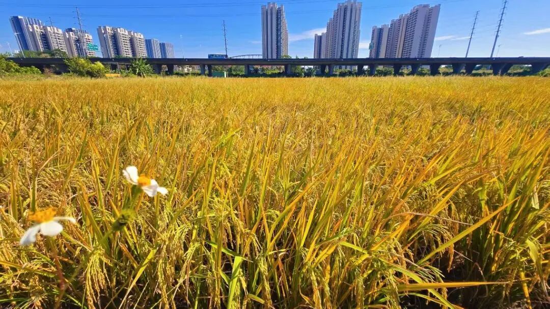 眼下正是晚稻成熟期,位于钟村街谢村村的大禾田农业公园,已然金黄一片,铺成了一幅金黄画卷。