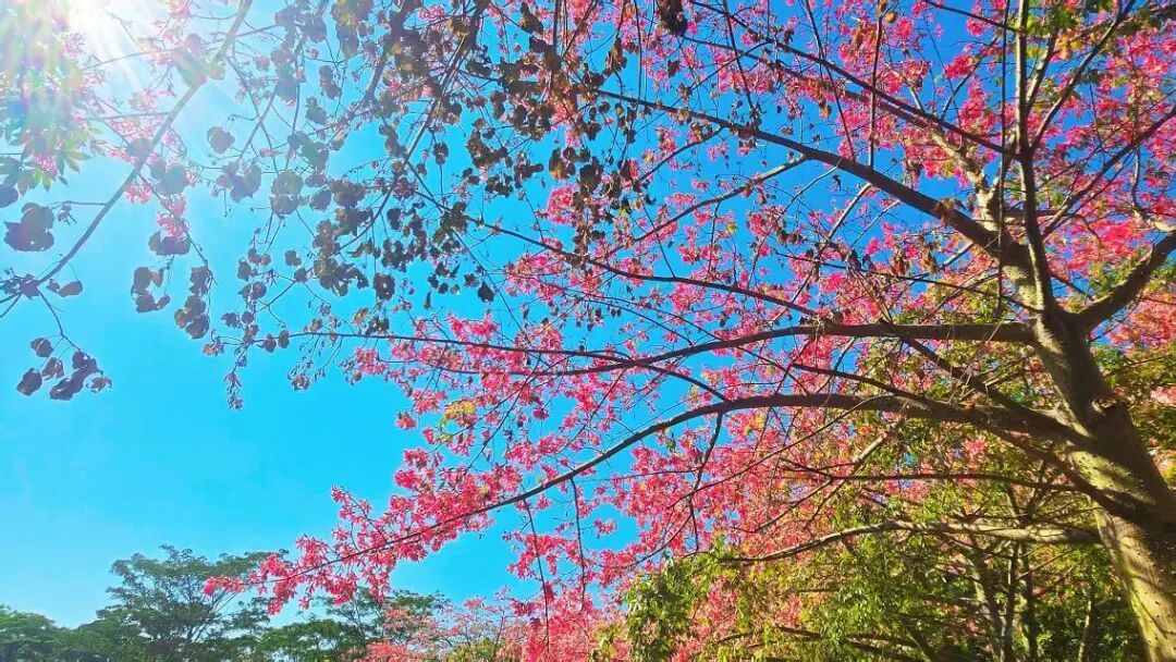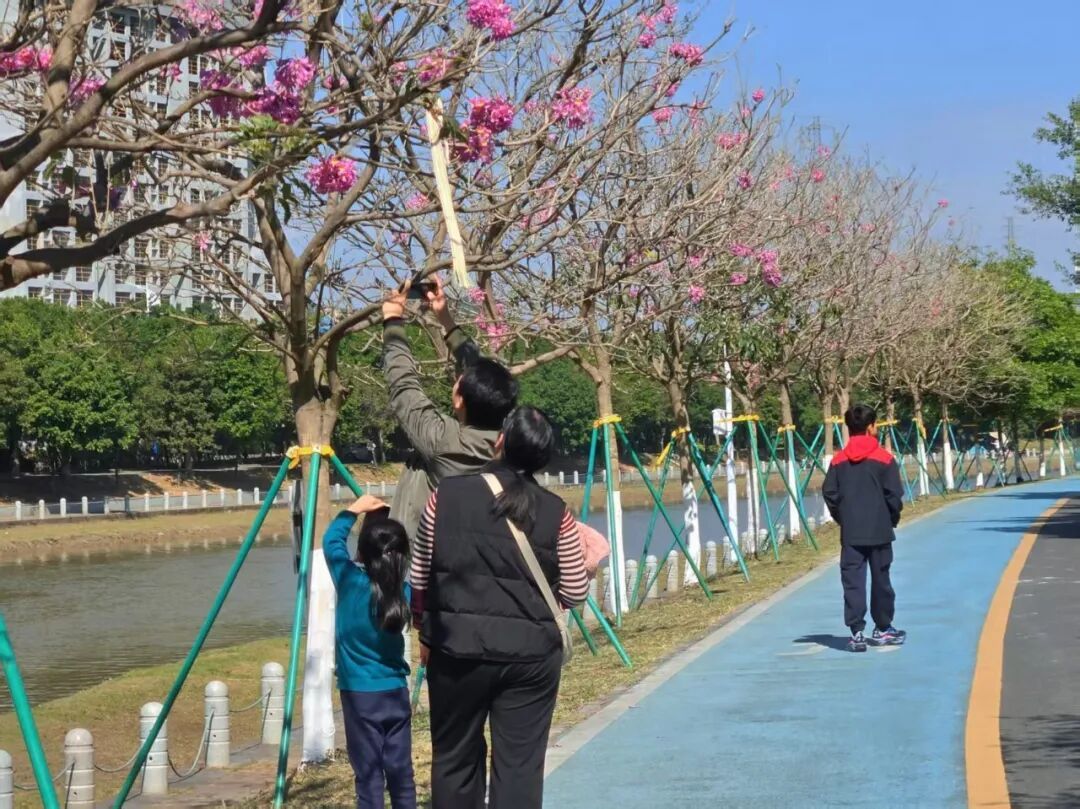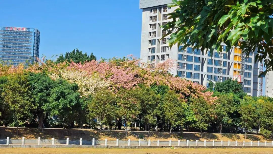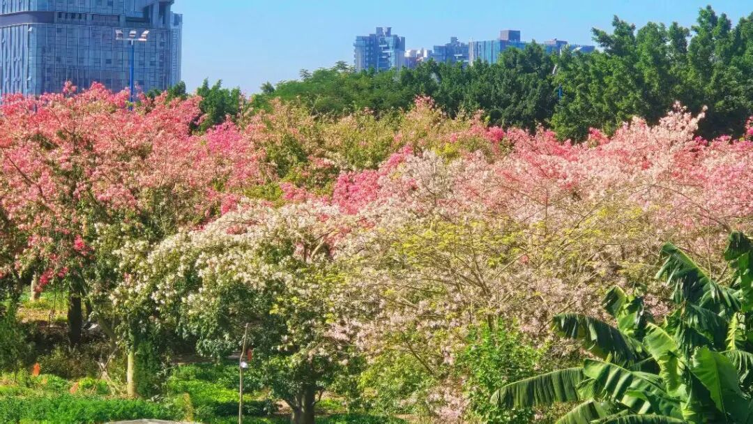 同样引人入胜的是,在屏山河另一边河岸农田里,有一大片宫粉紫荆正在肆意绽放,一簇簇、一团团粉紫色花朵随风摇曳,紫荆花的花瓣薄如蝉翼,在阳光下泛着细腻的光泽,与湛蓝的晴空撞了个满怀。