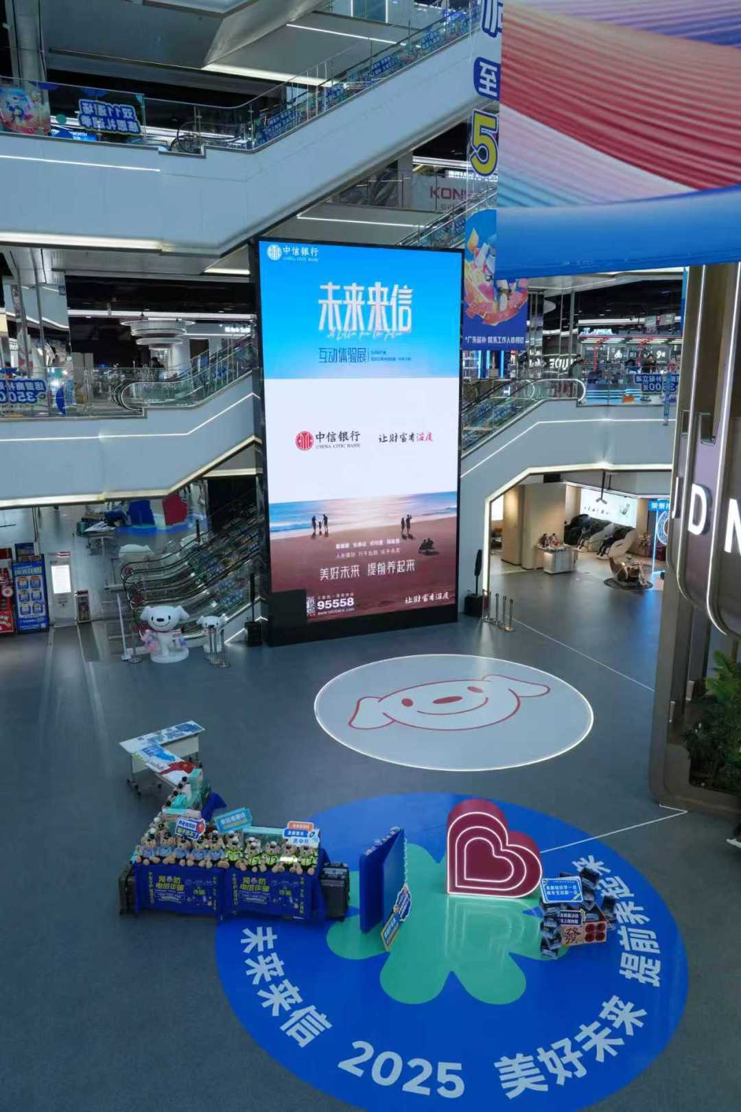 作为本次活动的联合主办场地,广州京东MALL依托其“潮科技+家场景”融合定位,为“未来来信”展览提供了理想的现实场景载体。展览期间,中信银行“养健康、绘事业、拓志趣、护爱意”四大主题展区,与京东MALL内各楼层业态形成巧妙呼应——从负一楼生活电器体验区、一楼D-park潮玩数码空间,到二楼电竞区、三楼全屋定制体验馆,金融理念与生活场景自然衔接,引导公众在真实场景中思考未来、规划生活。