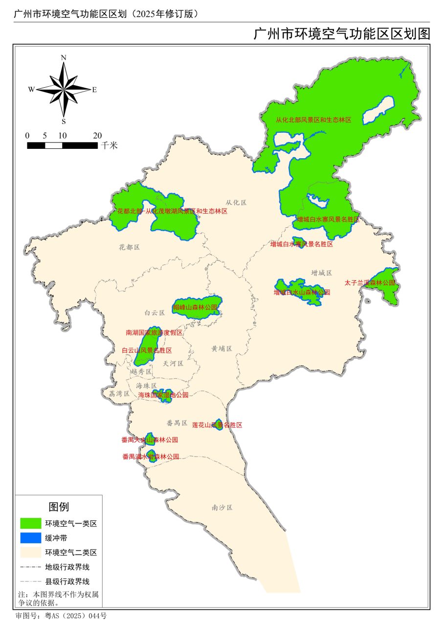 在旧版区划基础上,按照有关技术规范要求,结合广州市经济社会发展和环境保护工作的实际情况,全市共划定12个一类区(较旧版区划新增1个),面积为1583.94平方千米,分别为白云山风景名胜区、南湖国家旅游度假区、帽峰山森林公园、海珠国家湿地公园、莲花山风景名胜区、番禺大夫山森林公园、番禺滴水岩森林公园、增城白水山森林公园、太子兰溪森林公园、增城白水寨风景名胜区、从化北部风景区和生态林区、花都北部-从化茂墩湖风景区和生态林区;其中,白云山风景名胜区、南湖国家旅游度假区、莲花山风景名胜区等3个一类区范围不作调整,帽峰山森林公园等8个一类区范围进行调整,太子兰溪森林公园重点保护区域纳入一类区范围,实现与惠州市区域生态环境协同保护。除一类区之外的区域,均划定为二类区;为保障一类区环境空气质量,在二类区内沿一类区边界向外300米的范围划定为缓冲带,缓冲带面积149.93平方千米。