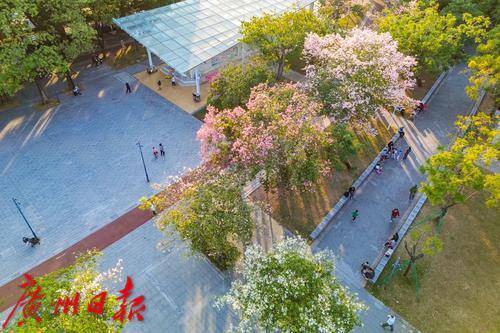 大沙头广场,市民在异木棉花树下赏花、晒太阳,感受秋日。