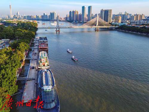 斜阳照射,珠江江面光影斑驳,江中船只在水面拉动浪花。
