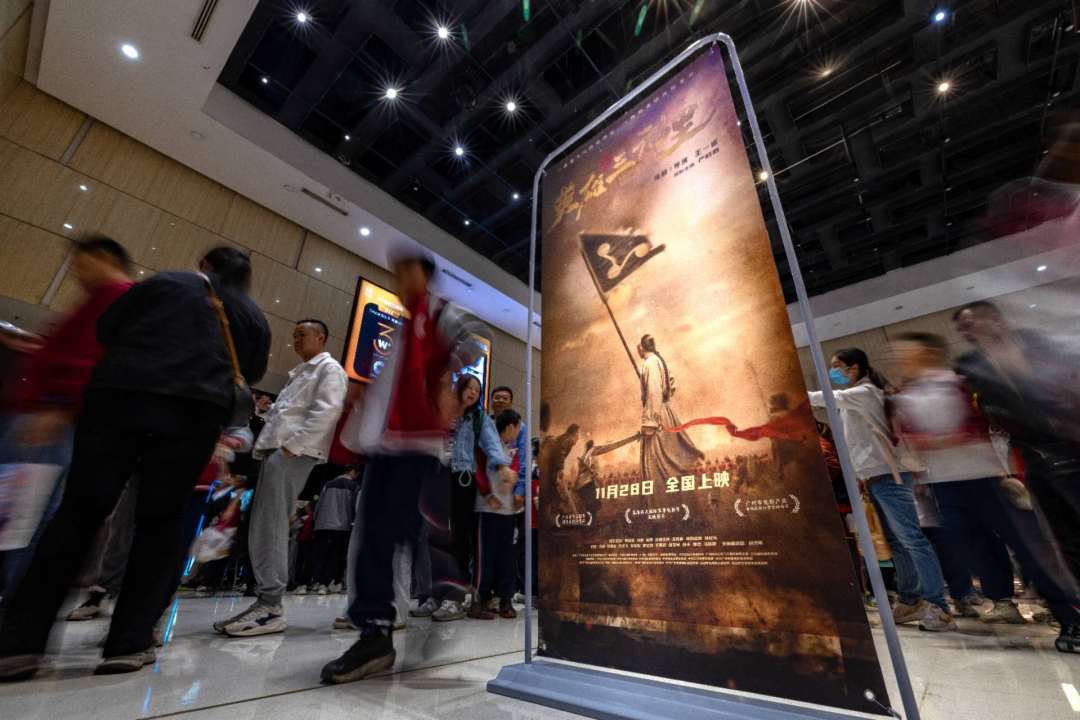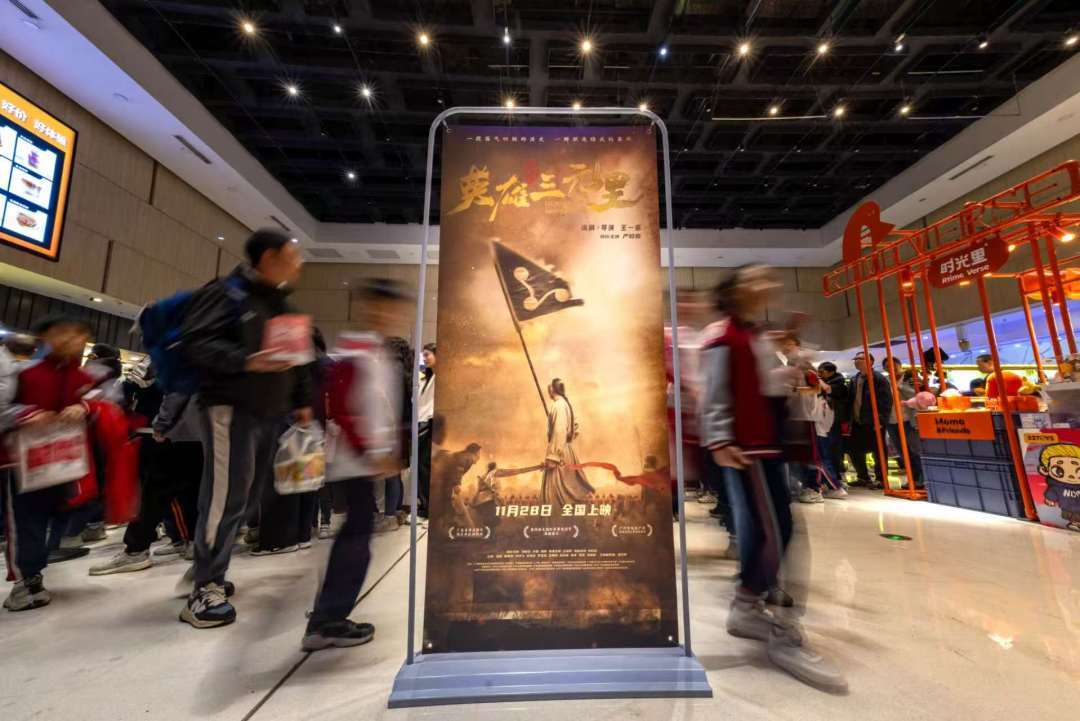 在白云万达影城,《英雄三元里》的宣发氛围浓厚:从商场1号门入口起,巨型电影海报和“观影请上3楼”的温馨提示展板一路引导;中庭悬挂着一条长达4米的条幅海报,视觉冲击力强;通道两侧,《英雄三元里》主题侧旗整齐排列,营造出庄重而热烈的观影氛围。