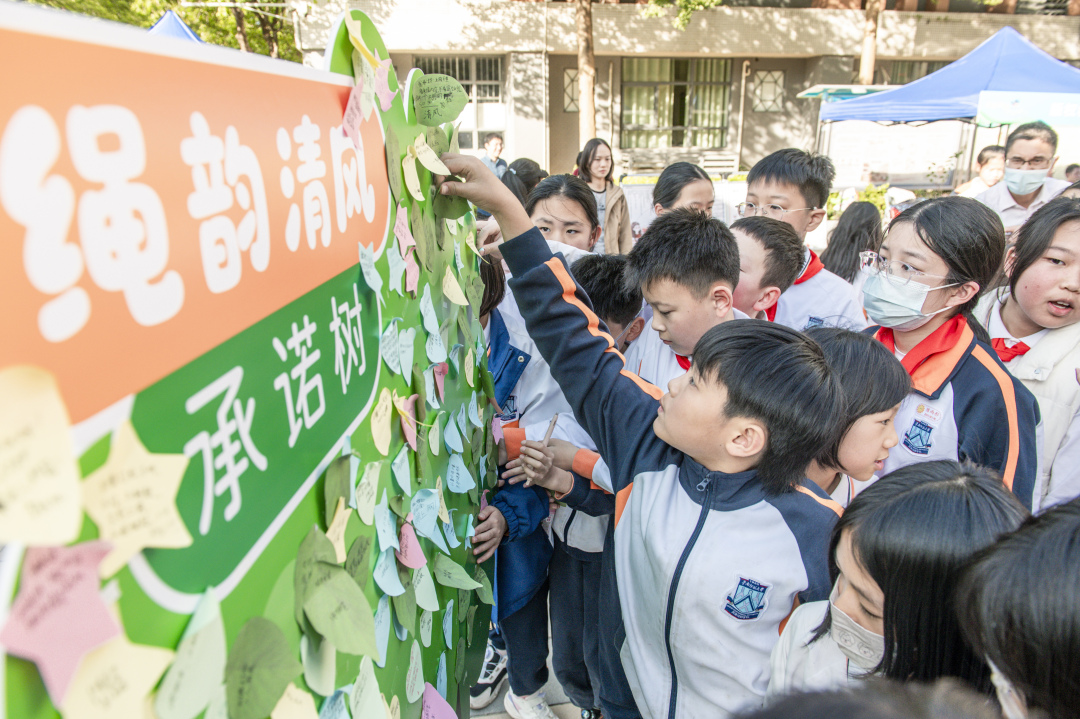 作为花都区“全国跳绳之乡”的特色创新环节,“绳韵清风”承诺树活动温情上演。领导嘉宾、老师和同学们手持便签纸,写下各自的护苗心愿与郑重承诺:“远离不良信息,做阳光少年”“拒绝盗版书籍,坚持绿色阅读”“家校携手同行,共护纯真童年”“文明上网冲浪,守护清朗空间”……一张张写满真挚愿望的便签纸贴满树枝,让承诺树枝繁叶茂、生机盎然,成为一道可视化的文明景观,时刻提醒大家践行初心、守护成长。