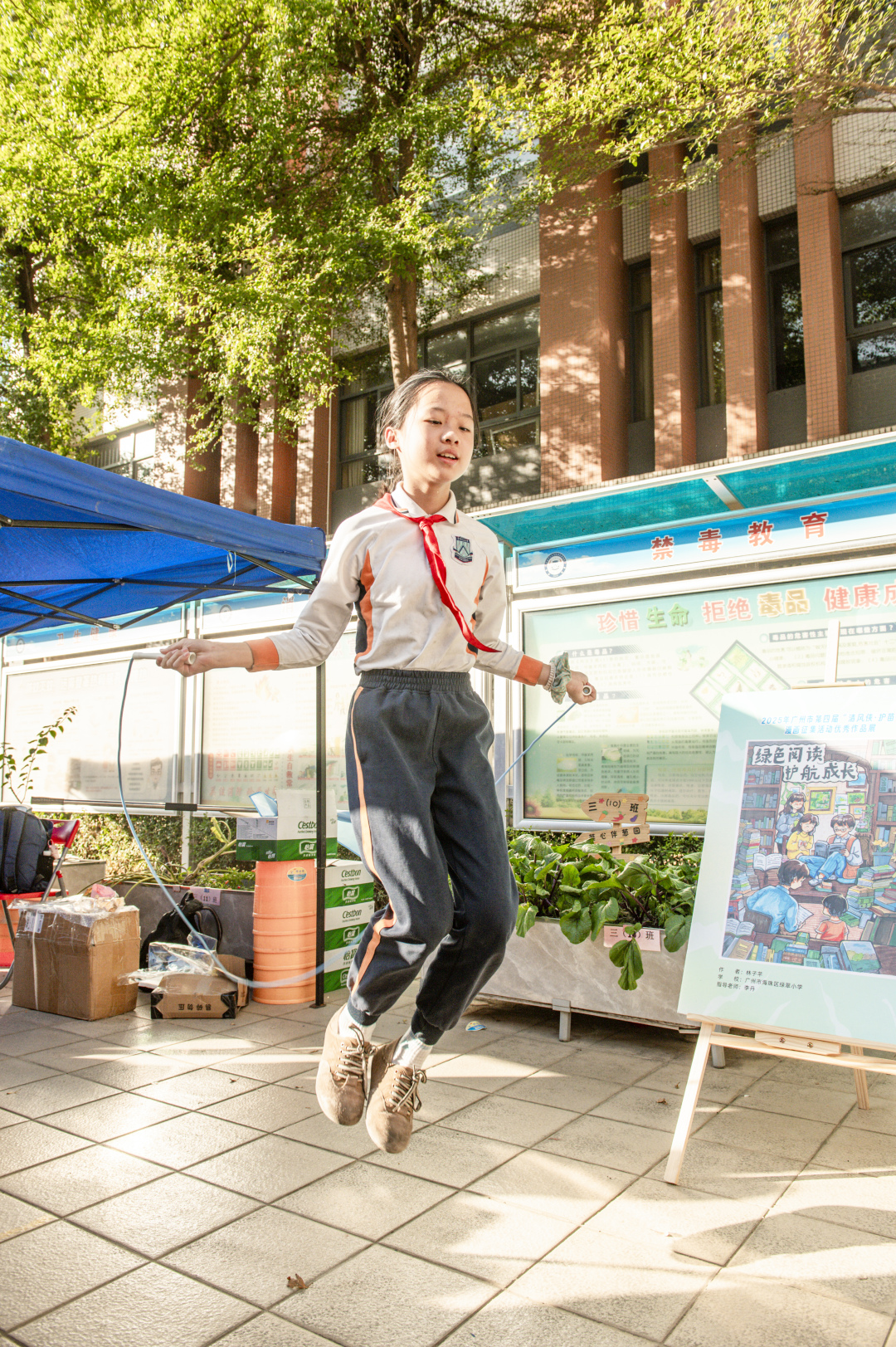 随后,“清风侠·护苗”跳绳闯关大挑战点燃全场热情,同学们摩拳擦掌、踊跃参与。花都将地域特色与护苗主题深度结合,让普及知识更接地气、更具吸引力:连续跳绳所需的坚持与专注,恰是守护成长之路需有的恒心;而闯关答题环节,则对应着青少年在成长中需跨越的“有害信息”“盗版书籍”等障碍,在趣味互动中夯实安全认知。
