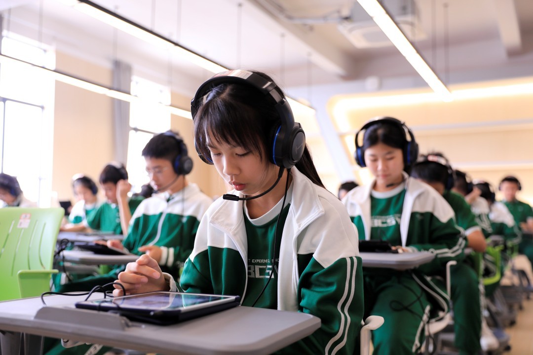 基于有效的“软硬兼修”——完备的硬件技术和软件资源,目前,拔萃实验学校的智能化外语教学项目已建成三大核心的应用场景:AI智慧课堂平板系统,覆盖全学科课堂教学及课后辅导;AI英语课堂,贯穿“教、学、练、评”全流程,支持各班口语课及专题训练;此外还有AI英语听说模拟考场,为六至九年级提供周、月及学期常态化测评,实现成绩实时反馈与权威评价。