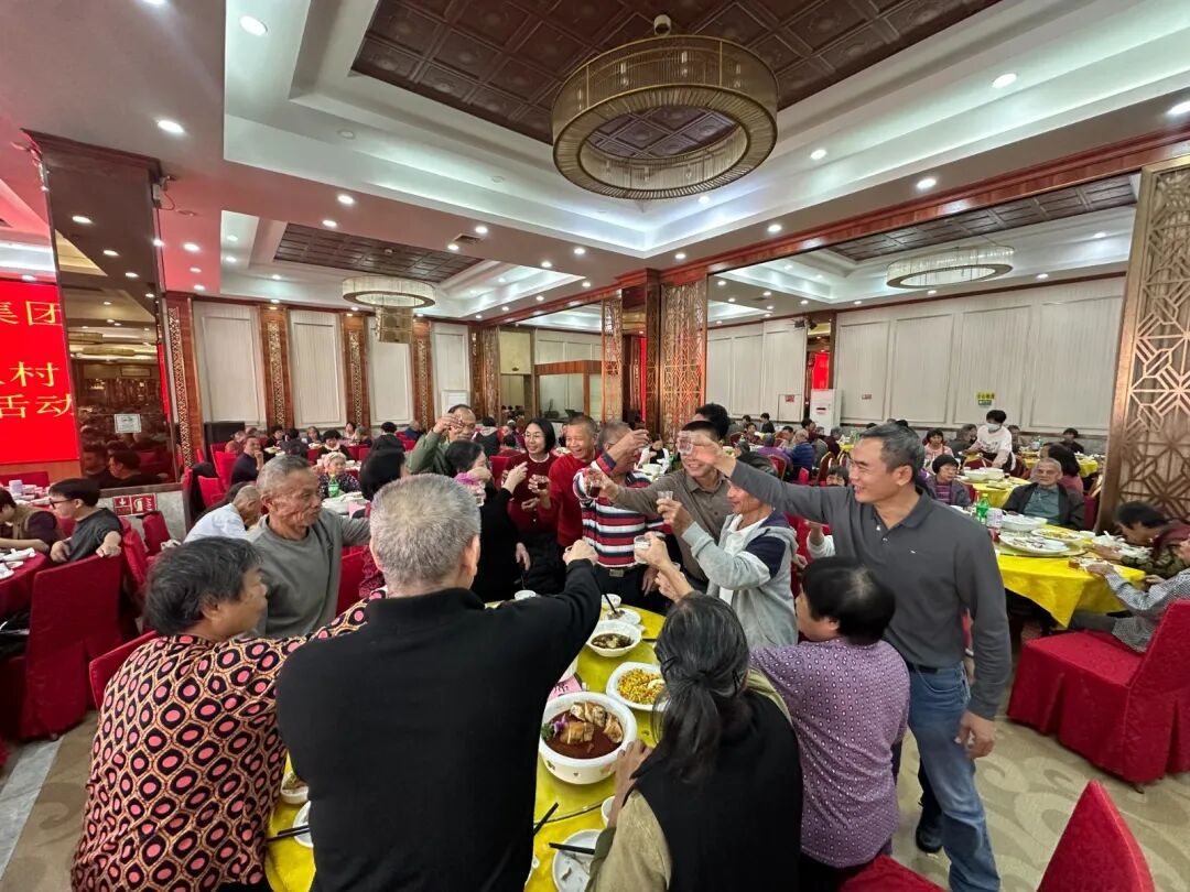 宴席期间,各村村干部与企业工作人员积极引导老人入座,全程提供周到服务,不时关切地询问老人的身体状况。对于乘坐轮椅前来的长者,现场也安排了专人陪同照料,确保其安心用餐。老人们围坐一起,一边品尝丰盛菜肴,一边畅谈生活变化与家常趣事,场面温馨融洽。