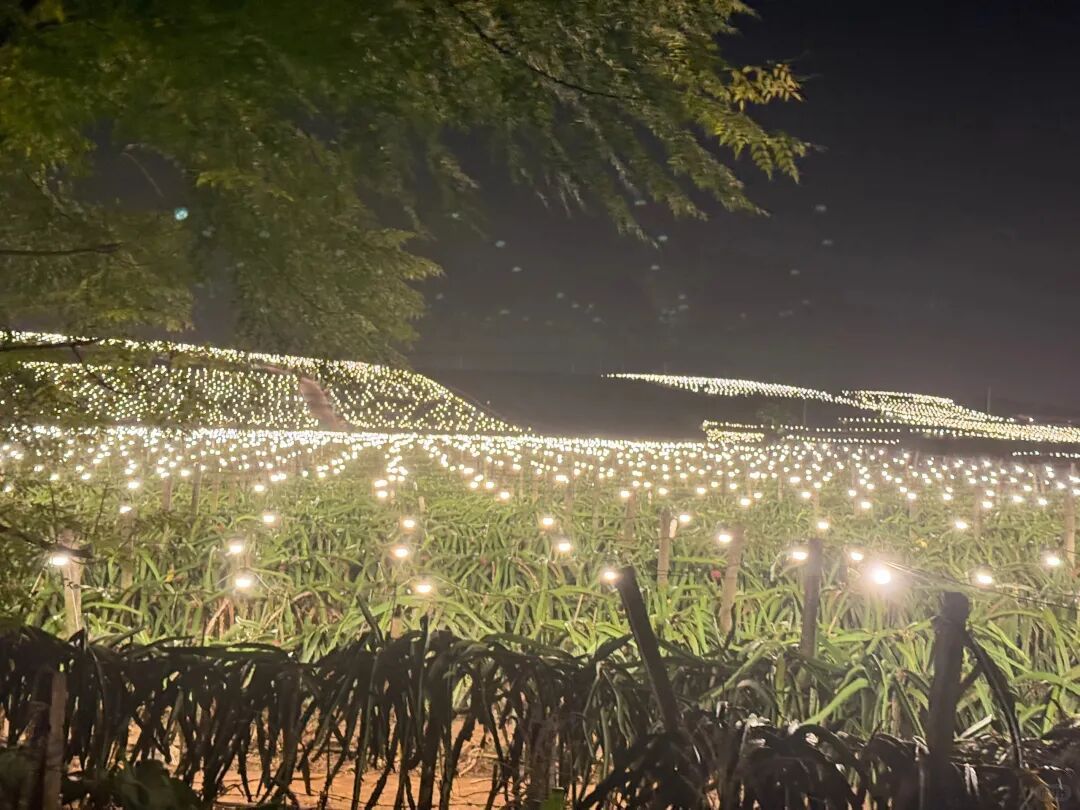 火龙果种植园定期开始上演的大型灯光秀,是为了让火龙果不睡觉,促进生产,从而让我们能在更多时段吃到美味营养的火龙果。别人是给点阳光就灿烂,火龙果咋这么好骗,给点灯光就行?