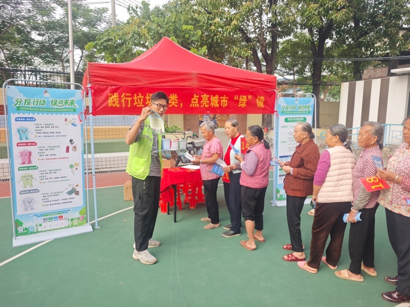 活动现场,几块内容详细的宣传展板格外引人注目,清晰的垃圾分类示意图引得村民们纷纷驻足细看。志愿者主动上前,结合展板内容耐心讲解分类标准。为激发群众的参与热情,现场设置了“垃圾磁力运输车”趣味游戏,寓教于乐。面对老年村民的疑问,志愿者则以贴近生活的家常话一一解答:“旧电池该投哪一类?”“剩菜怎么处理更合适?”通俗易懂的回应,让老人们在会心一笑中掌握分类要领。志愿者还引导大家跟着展板标语一起默念,帮助加深记忆。