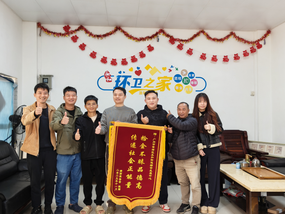 近日,市民周先生手持一面印着“拾金不昧品德尚 传递社会正能量”的锦旗交至黄埔区永和街道发展中心环卫班长何伟业手中,再三向他表达诚挚的感谢。