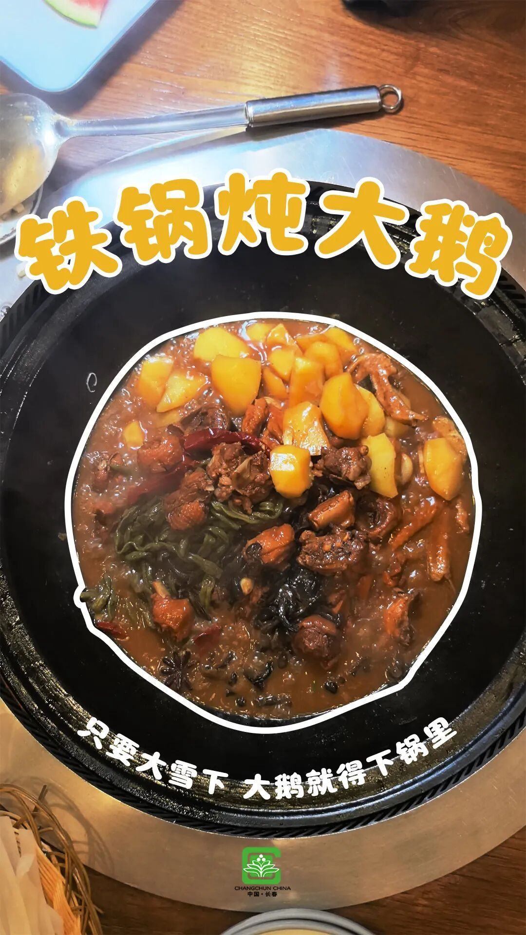 最妙的是那锅边贴着的一圈金黄玉米饼子,半截身子浸在浓稠滚烫的汤汁里,半截露在外面被蒸汽熏得松软。用筷子小心翼翼地起下一个,底部被铁锅烙得焦黄酥脆,咬上一口,咔嚓作响中带着粗粮的清甜;再夹起一块吸饱了汤汁的大鹅肉,皮糯肉烂,咸香中透着油脂的丰腴,滚烫的滋味顺着喉咙一路暖进胃里,瞬间驱散了在雪场积攒了一天的寒气,只让人想解开衣扣,在那蒸腾的热气中舒坦地长叹一声。