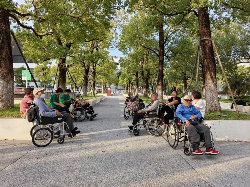 天河体育中心乘坐轮椅的老年人在树荫下休息。
