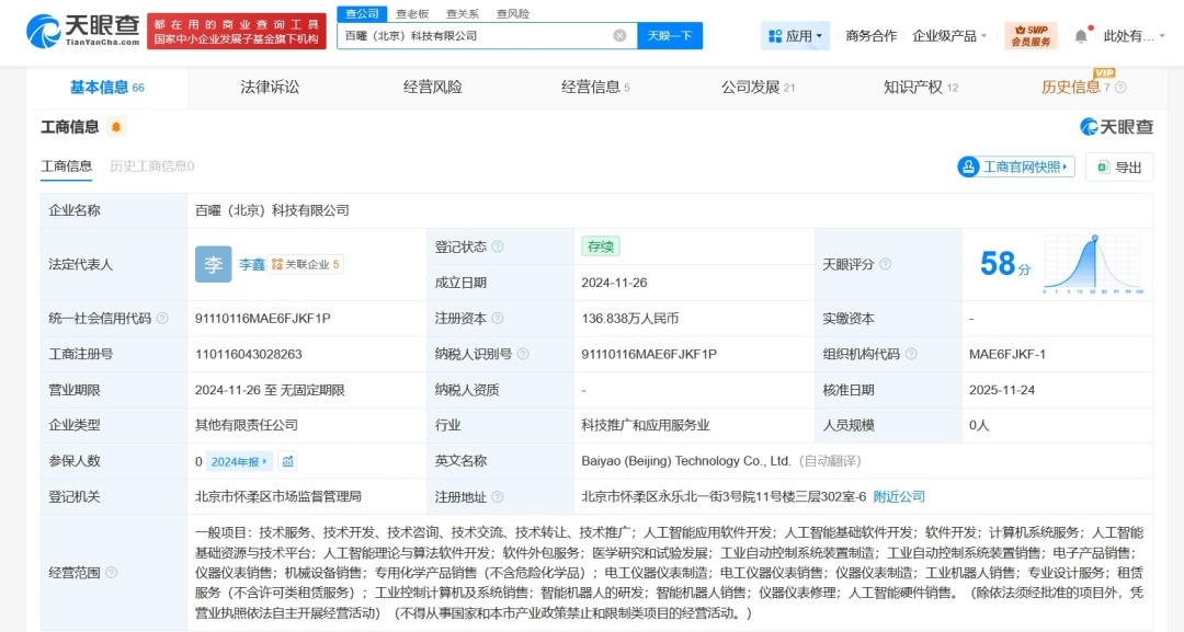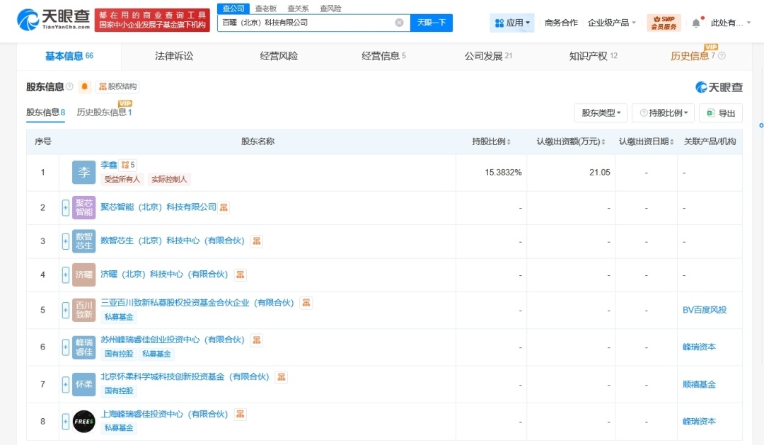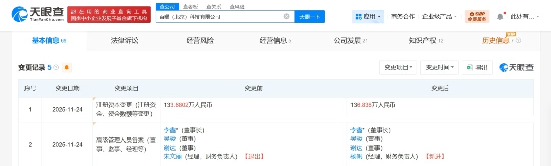 11月27日,天眼查工商信息显示,近日,百曜(北京)科技有限公司发生工商变更,新增百度旗下三亚百川致新私募股权投资基金合伙企业(有限合伙)为股东,注册资本由约133.7万元人民币增至约136.8万元人民币,同时,部分高管也发生变更。