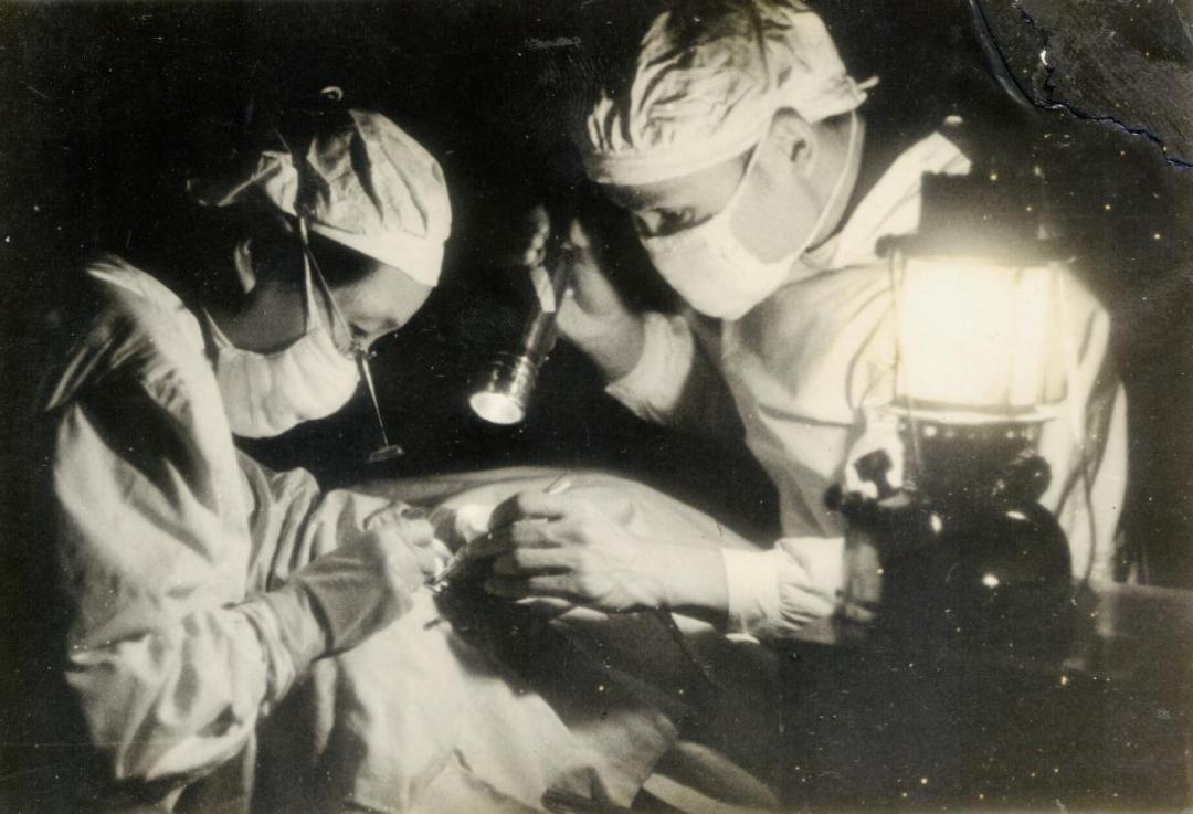 毛文书在煤油灯下做手术的历史照片。(左一为毛文书)