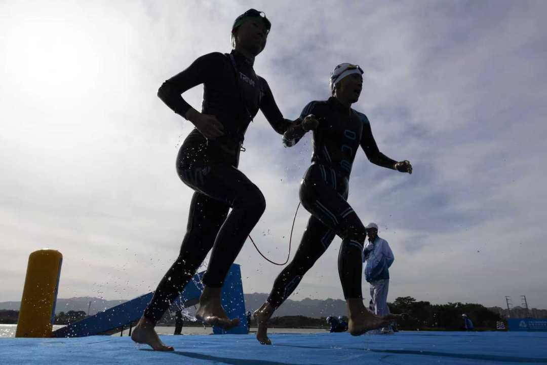 11月26日下午2点至4点,运动员进入赛场进行赛前演练,熟悉比赛路线。图为选手们在游泳上岸后直接进入换项区,准备自行车赛。