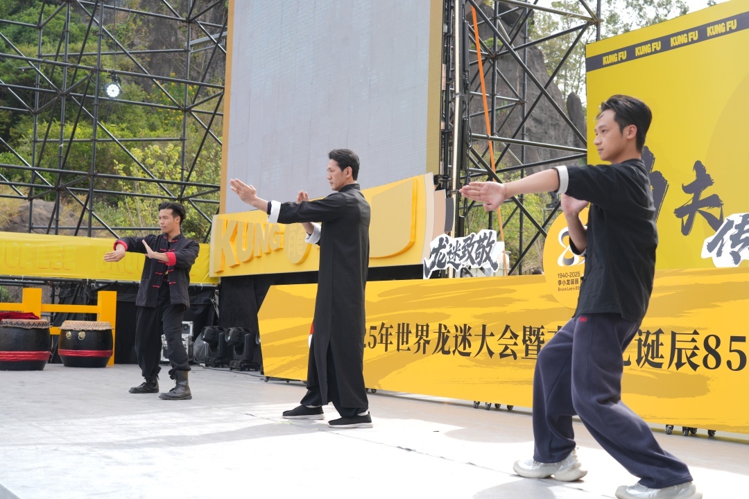 “自己作为李小龙的师侄,李小龙一直是我的偶像,能够在这个大会上带领大家致敬李小龙,非常的激动和自豪。”在大会的启幕仪式上,来自叶问咏春第二代传人、佛山咏春非遗代表性传承人董崇华还携手“世界龙迷会”的王家欣师傅和谭家毅师傅一起用咏春致敬李小龙。