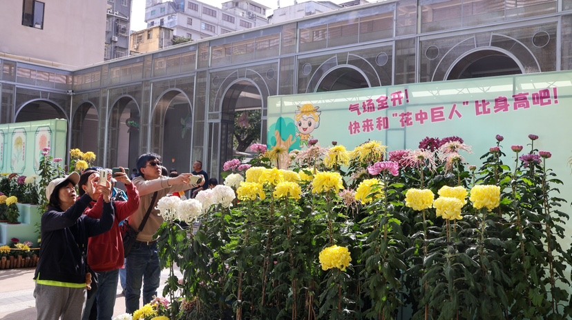 去年广受欢迎的“棒棒菊”今年再度升级,不仅品种与数量显著增多,更通过技术攻关首次实现了多层造型,使其花冠层次更为丰富,色彩表现力也大幅提升。不同品种的棒棒菊相继盛开,使菊球染上了红、黄、白、紫等不同的颜色,更显趣致。位于中心台的“彩色菊球”经过精心培育与布置,以饱满的花色与规整的球形构成壮丽的视觉焦点,深受摄影发烧友的喜爱。而“高放菊”则以1.8米的挺拔身姿,继续其与市民“比高”的趣味互动,平添了许多生气。