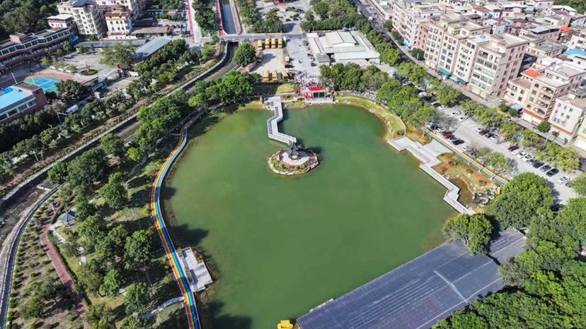 环湖而建的彩虹步道如彩练般将各个景点串联。步道环湖约600米,配备安全防护栏,沿线设置3处亲水平台,与芦湾涌原有碧道联通,形成完整的慢行系统。