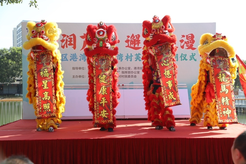 开园仪式在阵阵锣鼓声中拉开序幕,四头醒狮随着鼓点节奏欢腾起舞。在点睛环节,大家手持朱砂笔,为雄狮点睛启灵,寄托着对芦湾村未来发展的美好祝愿。群狮献瑞表演中,醒狮们以矫健的身姿完成采青、吐福等传统动作,“福星高照”“心想事成”等祝福徐徐展开,赢得阵阵掌声。