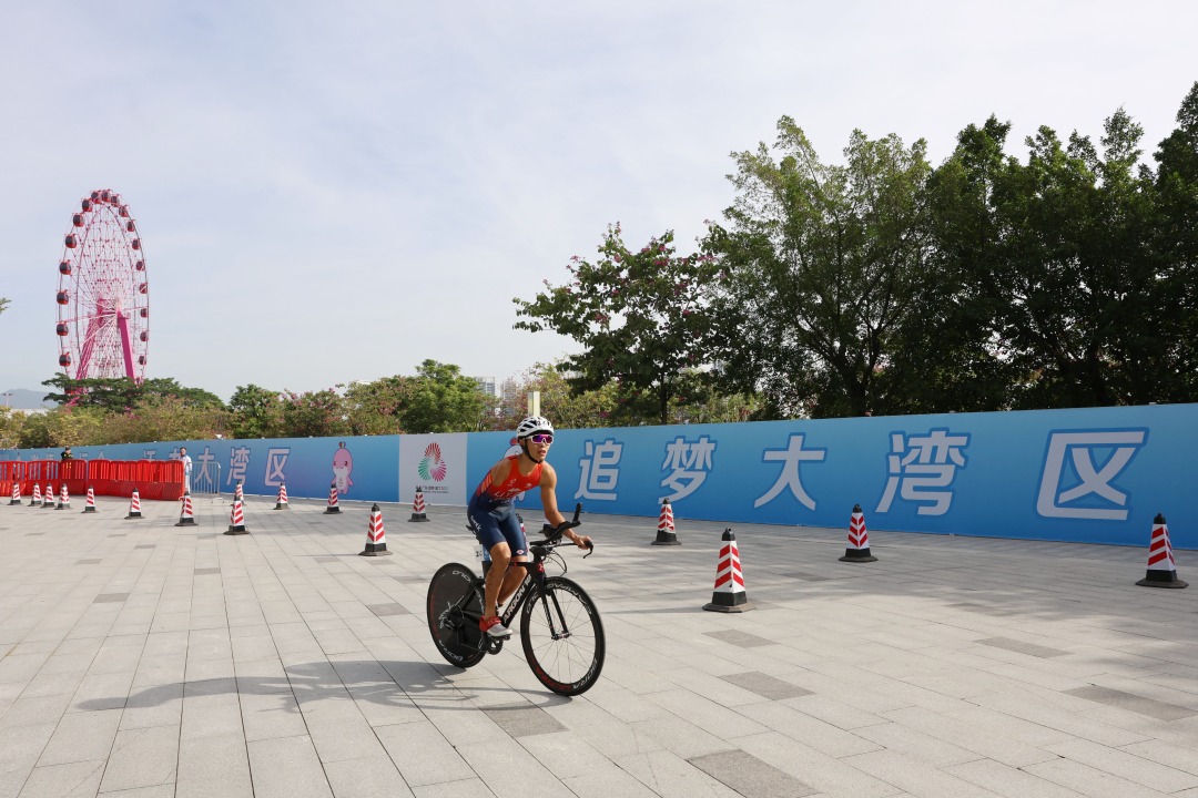 三棒李奕宗在骑行环节比赛中。