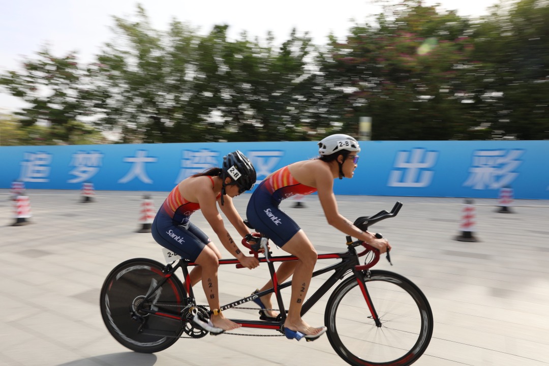 与引导员谭嘉怡参加单车比赛的杨晓婷(左一)。