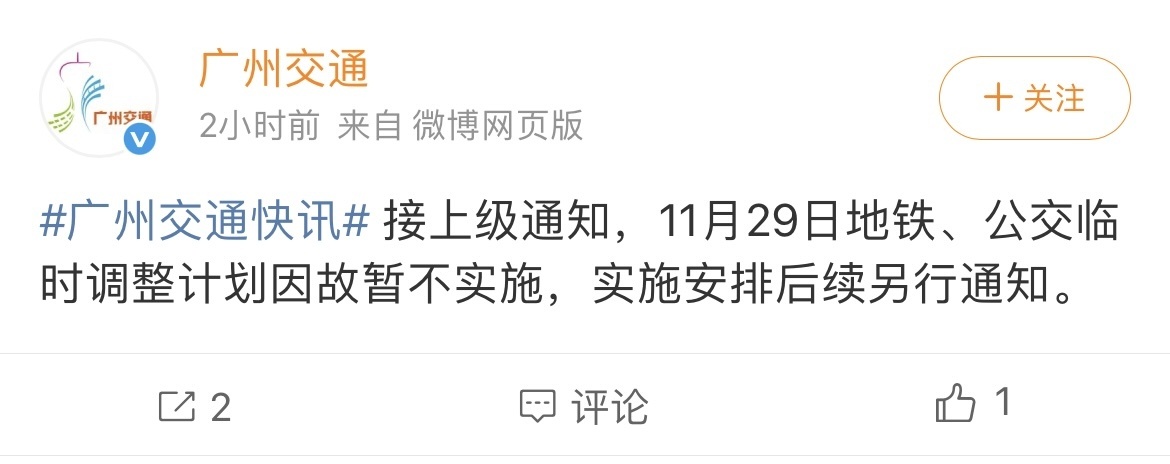 11月28日,据广州交通消息,11月29日地铁、公交临时调整计划因故暂不实施,实施安排后续另行通知。