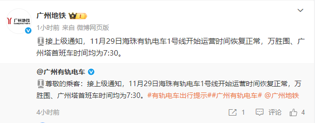 广州地铁官方微博也发布消息,接上级通知,11月29日海珠有轨电车1号线开始运营时间恢复正常,万胜围、广州塔首班车时间均为7:30。
