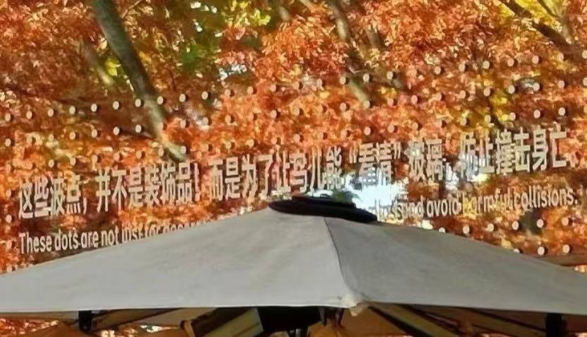 这一做法也与《全国防鸟撞行动网络2025年度报告》的建议一致,该报告提出,防鸟撞其中一种解决路径就是对玻璃进行可见性处理,“譬如采用点阵贴膜、蚀刻玻璃或 UV 涂层玻璃”。除此之外,也可以对周边生境进行优化,避免玻璃反射植被或天空,减少“虚假通道”效应。