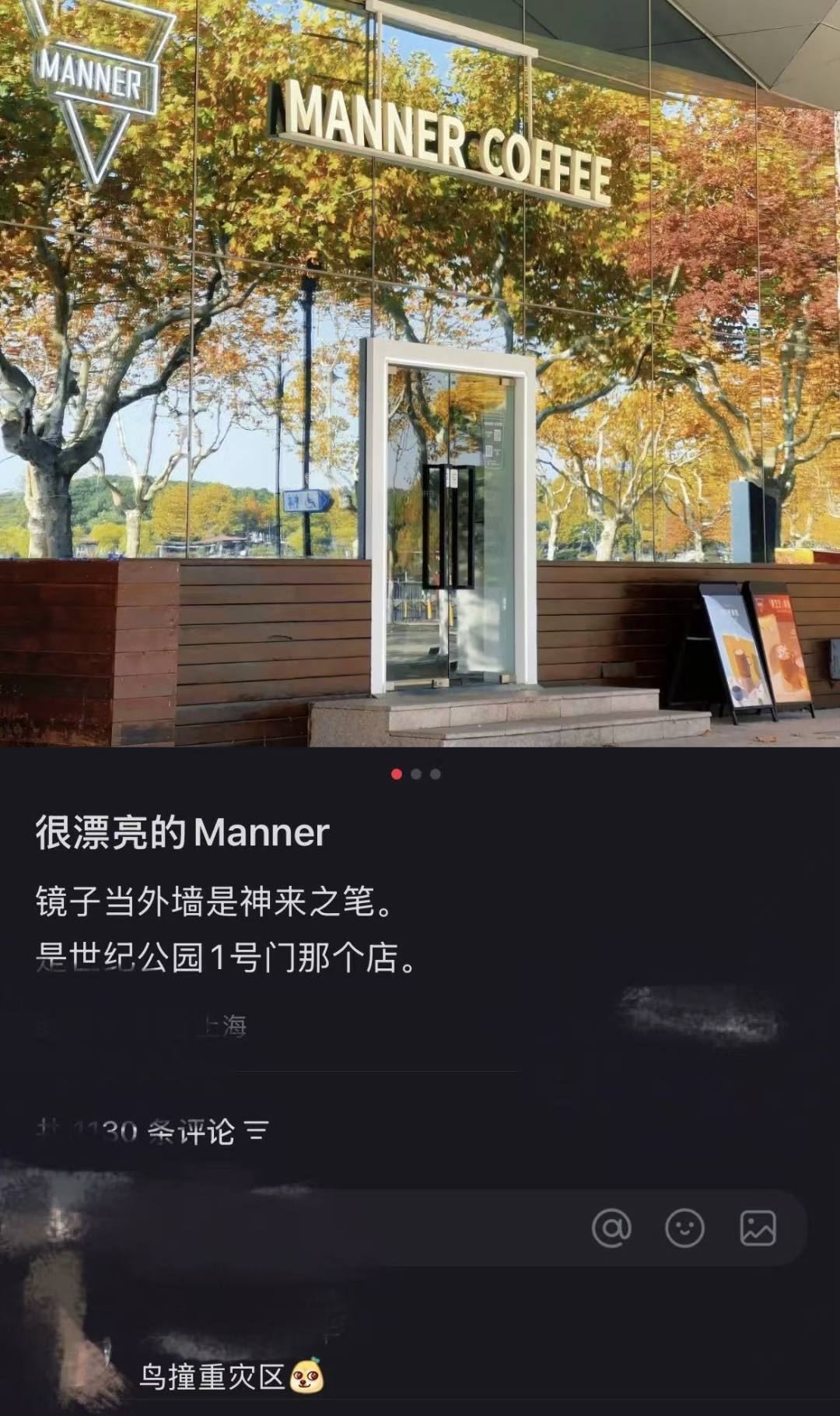Manner门店外墙由多块玻璃构成,社交媒体上有网友担忧会成为鸟撞重灾区