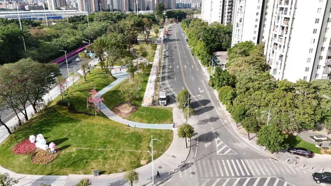 天坤一路(健明六路—未来印段)是智谷片区重要的“一横”,长约1100米、宽约30米,双向4车道,设计车速30km/h,解决了人车混行、通行效率低、照明不足及积水扬尘等问题,消除片区安全隐患。项目在广园路边建设了5.1万平方米的绿化公园、1900米健身步道、10个坐凳、5处休憩点、2处康体设施、1个风雨亭,为居民提供更宜居的休闲空间,附近居民反馈“绿树多、环境好,是散步遛娃的好去处”,体现了城市公共空间的焕新升级。作为天河智谷片区的重点项目,它不仅加快了智谷片区路网建设步伐,也为区域产业发展和居民绿色出行赋能添彩。