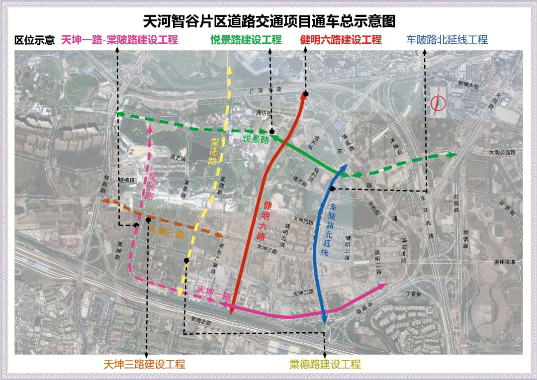 同时,天河区代建局正加快推进智谷片区重点道路的建设工作,包括天坤一路西段、棠陂路、天坤三路、棠德路等关键道路,全面铺开“六横七纵”路网体系建设,将打通智谷片区的交通主动脉,织密城市内部与外部的连接网络,大大提升区域通达性与通行效率。