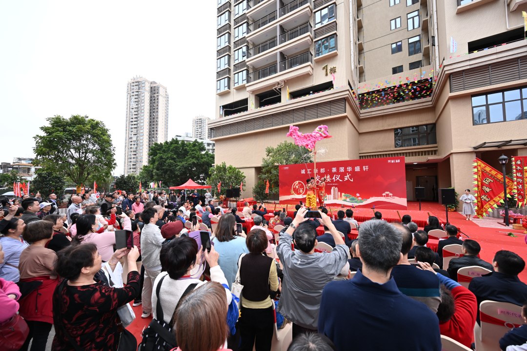 华盛轩是茶滘城中村改造的重要安置项目,项目地处诚汇新都,占地约0.8万平方米,总建筑面积约3.7万平方米,提供296套高品质住宅,配套约5000平方米集体物业。当天上午,醒狮欢腾,村民代表接过象征“回家”的钥匙,脸上写满喜悦与期待。随后,嘉宾与村民们共同走进崭新楼宇参观。