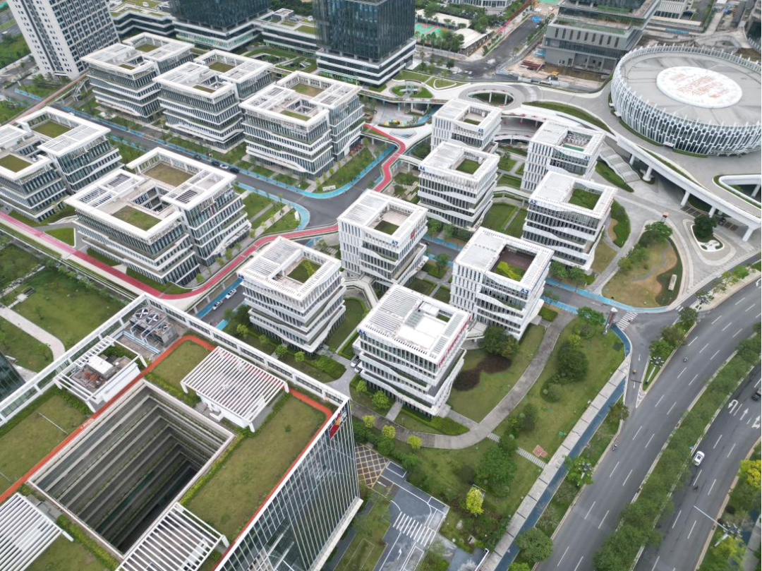 在广州市黄埔区知识城广场,整个园区集会展中心、产业写字楼、芯片设计大楼生态合院和园区商业服务于一体。屋面合理分区,构架与建筑立面一体化设计,遮挡空调机组等设备,同时设有绿化平台、运动区域、连廊天桥等供园区内员工交流休闲使用。其中二层连廊上铺设的红色橡胶跑道引人注意,跑道与园区的办公楼、公寓等相连通,下班后轻松跑一圈再回家。