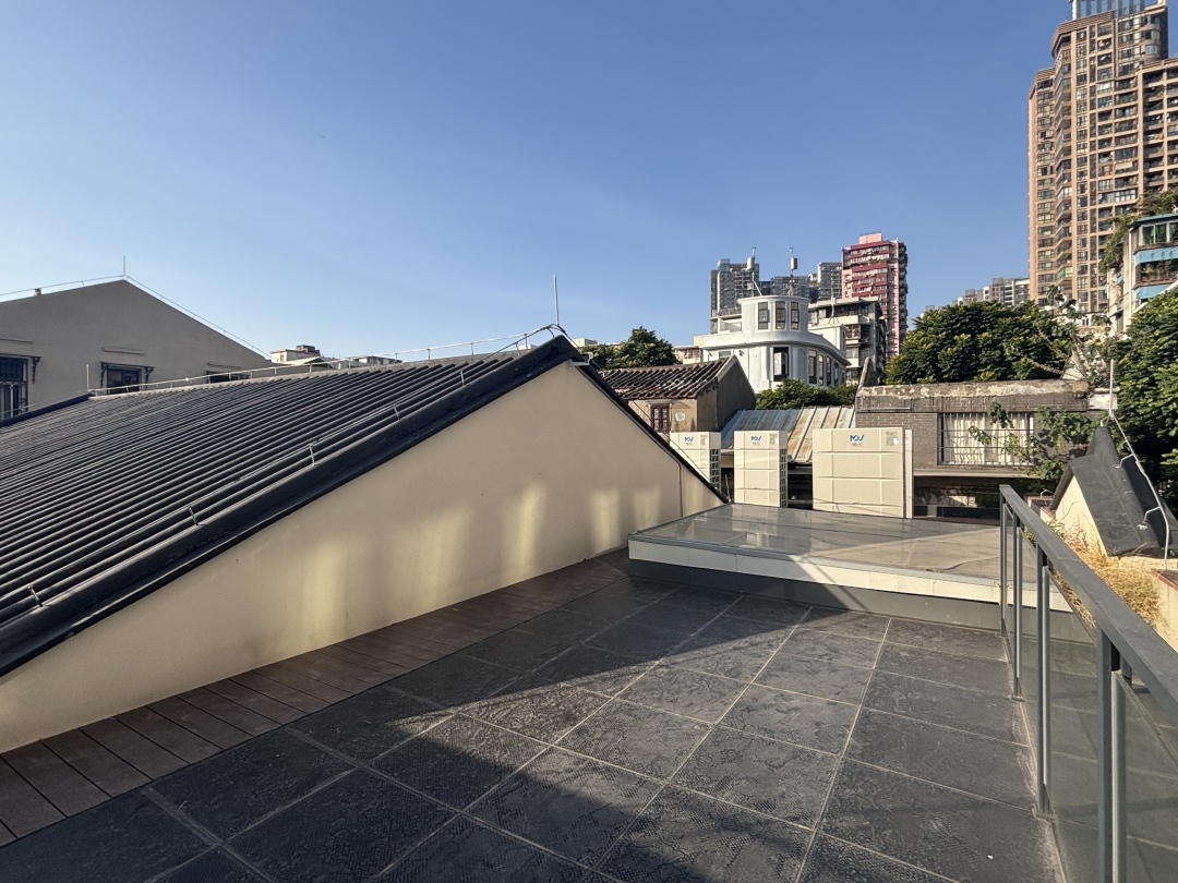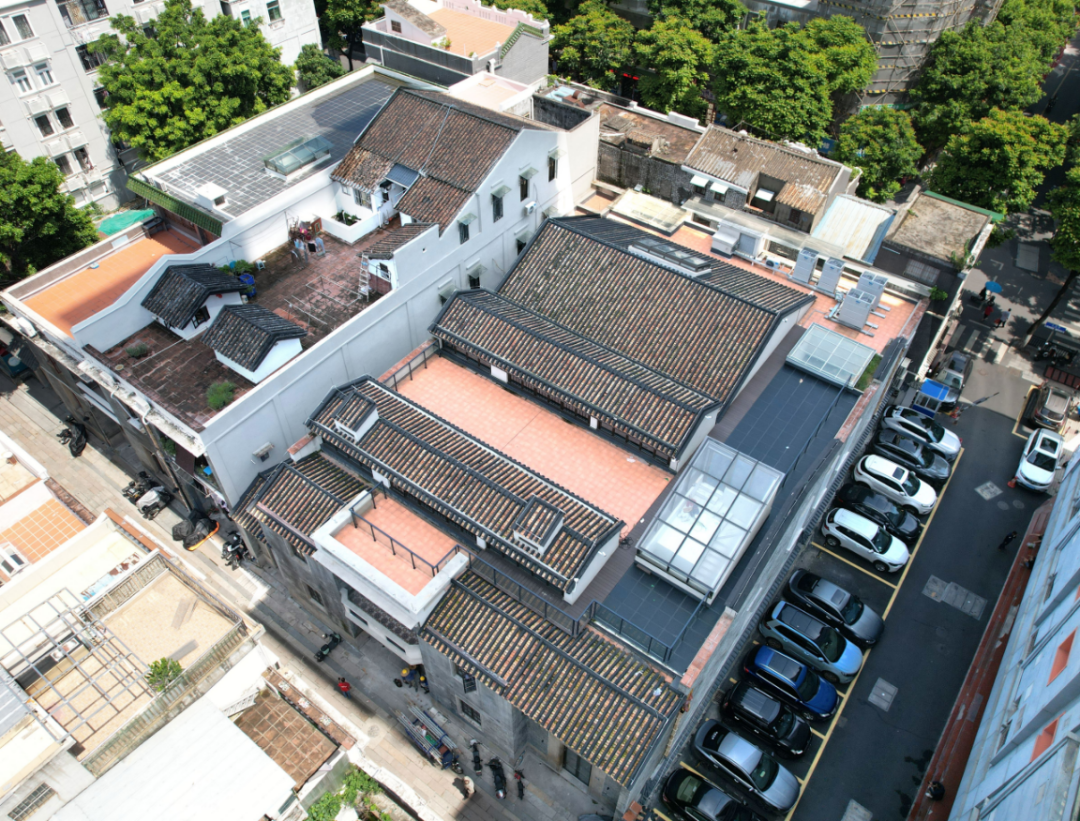 宝庆新中约10—12-1号,紧邻永庆坊,位于多宝路历史文化街区核心保护范围。负责该项目设计的象城建筑规划设计(广州)有限公司杨念翰介绍说:“这是一栋民居,是传统风貌建筑的预保护对象。在我们进场时已经空置多年,一至二层的楼板以及屋面都存在大面积坍塌的情况,我们使用框架结构置换了原有的砖木结构。满足后续的使用功能后,我们保留第五立面平坡结合的方式,同时引入了光伏板新材料,让建筑满足现代生活需求的同时也与整个街区风貌相协调。”