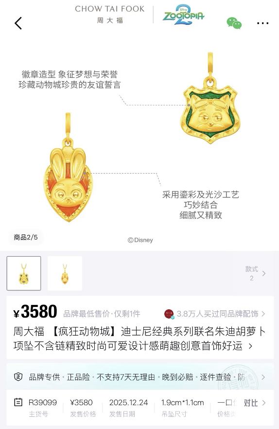 值得一提的是,《疯狂动物城2》最贵的联名当属周大福的“痛金”,本次周大福推出了4个系列产品,朱迪联名款胡萝卜黄金吊坠售价3280元,周大福尼克朱迪联名款转运珠售价2380元,刷新了联名价格上限。
