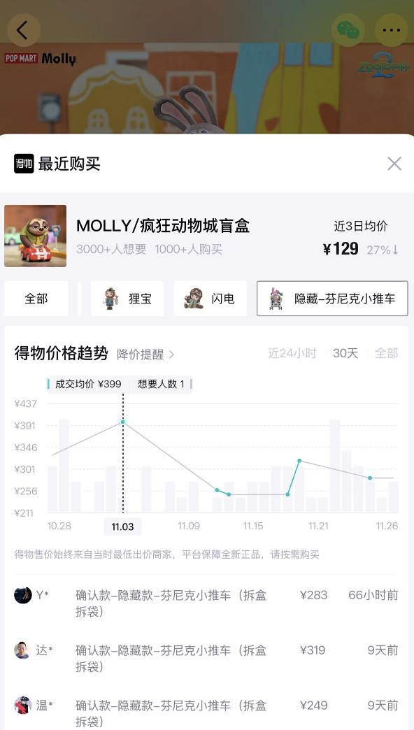 (泡泡玛特《疯狂动物城2》的联名系列盲盒隐藏款“芬尼克推小车”价格)