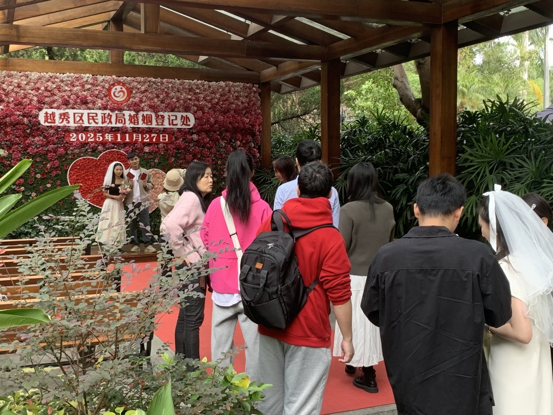 网上预约已是“火爆”,领证登记现场也是热闹无比。记者在11月27日来到位于东风公园的越秀区民政局婚姻登记处,虽然是上班日,但现场依然有很多新人前来领证结婚。现场开放所有办理窗口,新人们在现场需要凭预约号排队等候。在户外留影区,一对对新人们也排起了长长的队伍轮候拍照留念。“抢不到周末的号,只能约上班日时间来领证了。”新人吴小姐说。
