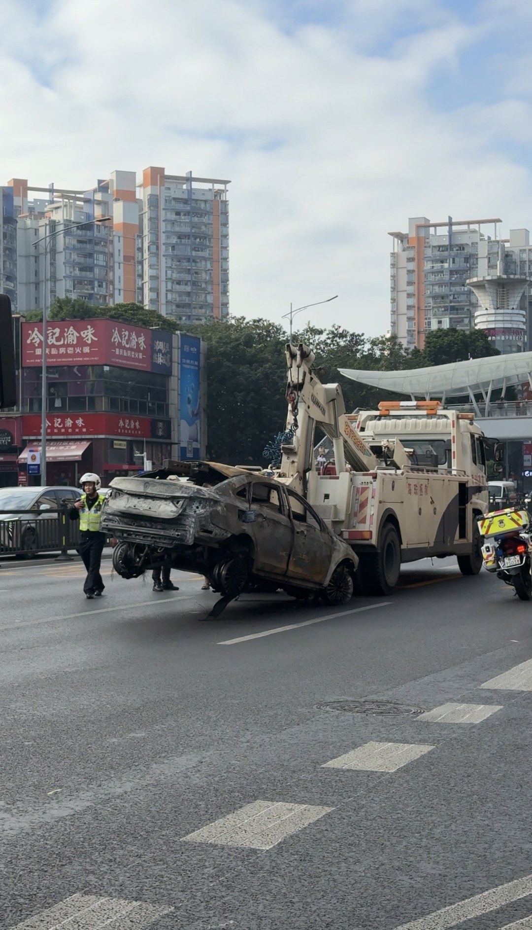 一辆被烧的小轿车被拖走
