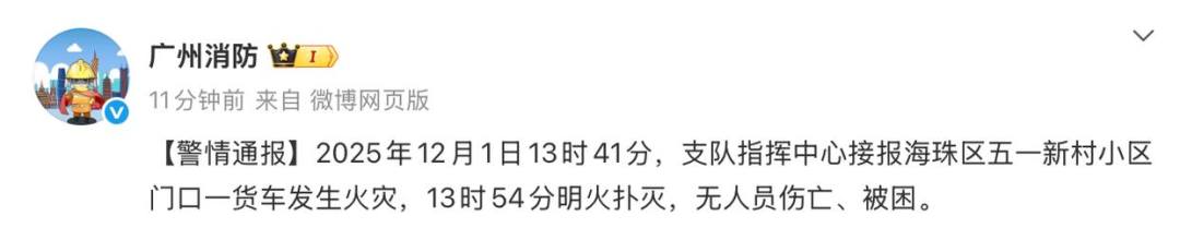 据广州市消防救援支队通报,2025年12月1日13时41分,支队指挥中心接报海珠区五一新村小区门口一货车发生火灾,13时54分明火扑灭,无人员伤亡、被困。