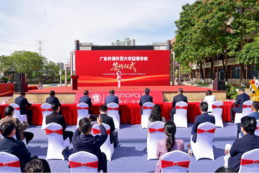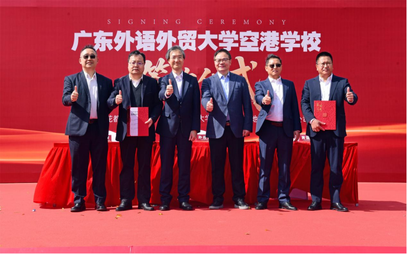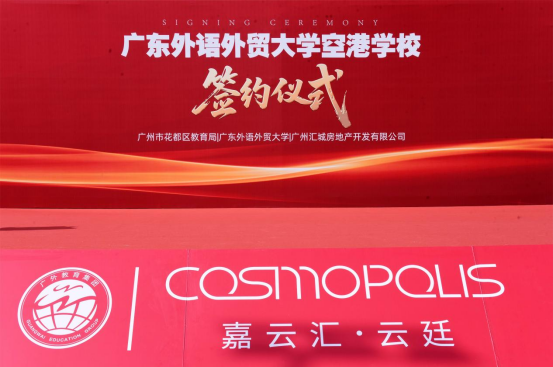 仪式现场,广东外语外贸大学、花都区教育局与嘉华国际集团三方共同签署《合作办学协议书》,原广州市花都区新雅街嘉行学校将进行升级改造,拟更名为“广东外语外贸大学空港学校”(下称“广外空港学校”),广外空港学校建设正式启动。