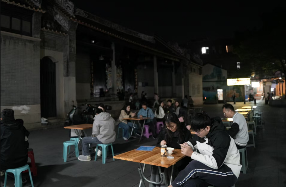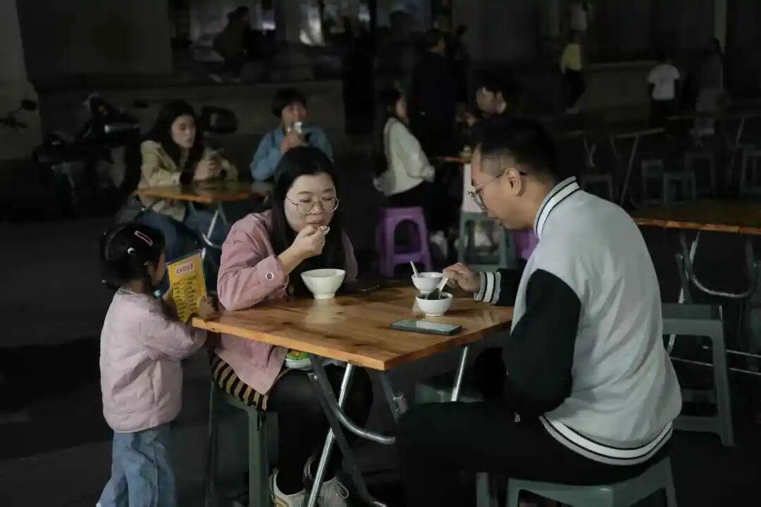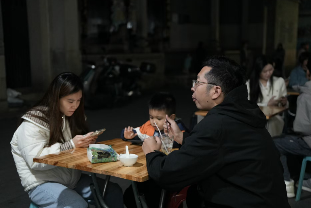 祠堂的古朴在夜色映照下,记者看到一家三口占了张桌子:孩子咬着绿豆沙汤圆里的糯米圆子,跑两步又回来扒拉两口西米露糖水;年轻父母看着孩子笑,手里的芝麻糊还冒着热气。“我们在这儿吃了十年,从谈恋爱吃到孩子会跑。”李女士给丈夫添了勺西米,“阿姨的糖水不花哨,就是家里的味道,能把一天的累都化在甜里。”