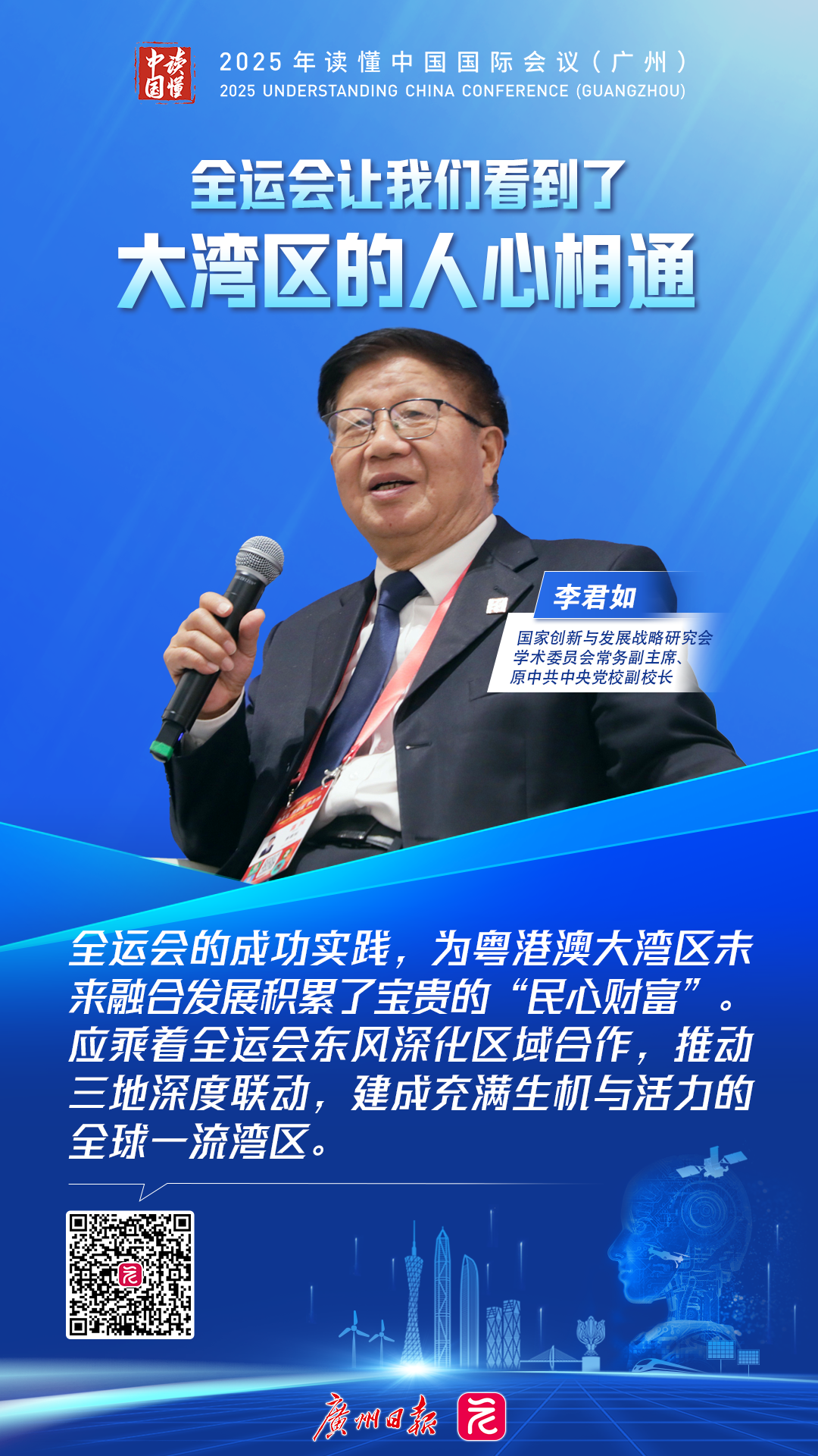 李君如表示,粤港澳大湾区既要充分发挥三地的独特优势,又要形成三地群众的共识,同时通过相应的政策、法律法规提供保障。当前应该乘着全运会东风深化区域合作,推动粤港澳三地打破壁垒、深度联动,建成充满生机与活力的全球一流湾区。“我相信粤港澳大湾区的未来是非常灿烂的。”李君如说。