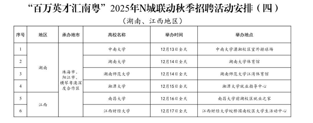链接:“百万英才汇南粤”2025年N城联动秋季招聘活动湖南、江西地区高校招聘安排(如有调整将及时公布)