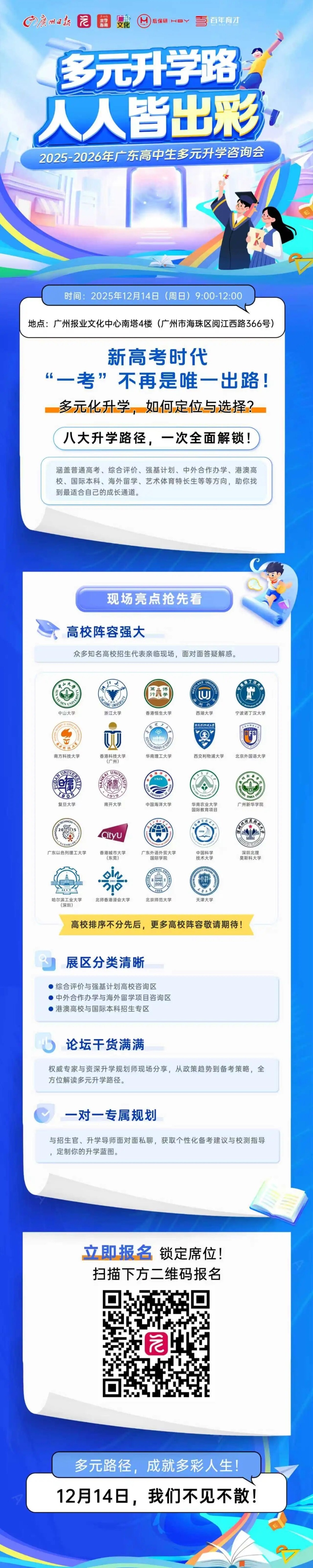 为帮助考生与家庭厘清方向,广州日报将于12月14日在广报中心4楼举办“多元升学咨询会”,现场设置: