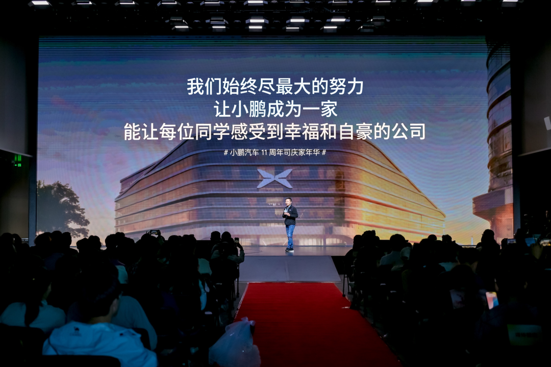 当天的氛围热烈,“剪腿版”IRON机器人以静态形式亮相,鹏厂吃喝玩乐集市、顶校学霸面对面、相亲角等多个互动区域成为活动亮点。小鹏汽车董事长CEO何小鹏首次以“向同学和家人们汇报”的方式,分享了公司十一年的创业成果以及员工背后的支持力量,并介绍了小鹏在员工关怀、工作环境与组织成长方面的最新进展。活动现场,何小鹏还为服务超过十年的员工家庭颁发了纪念勋章,表达了对员工家属无私支持的深深感谢。
