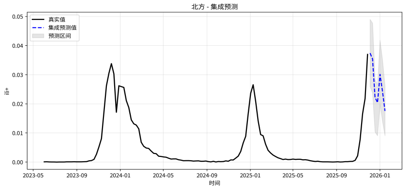 结果显示,北方地区预计将在2025年12月中旬左右进入阶段性高峰,之后进入短期下降阶段,随后将在2026年1月初出现小范围反弹,并逐步下降。